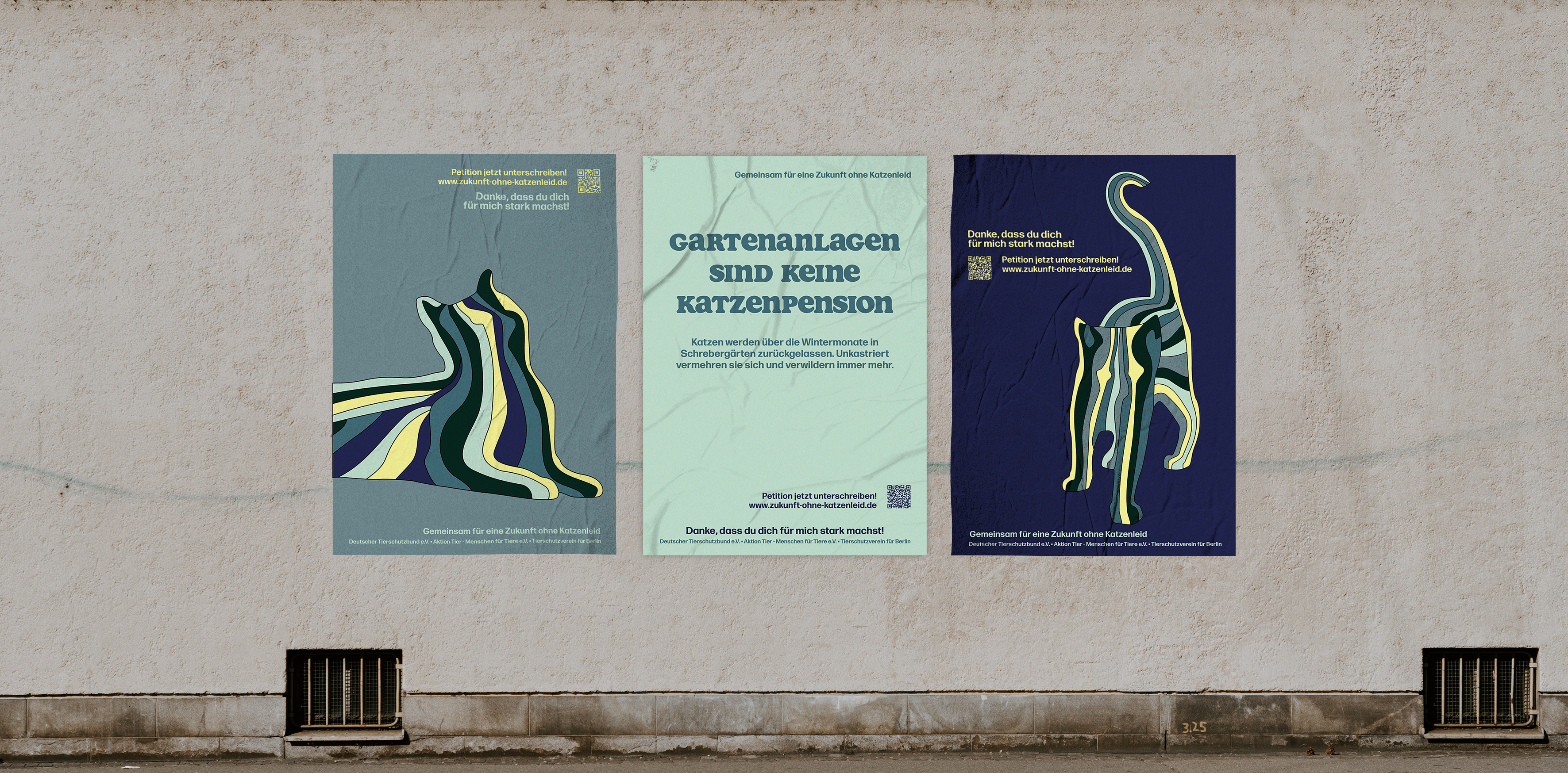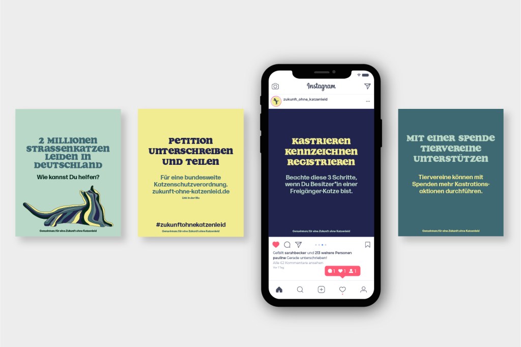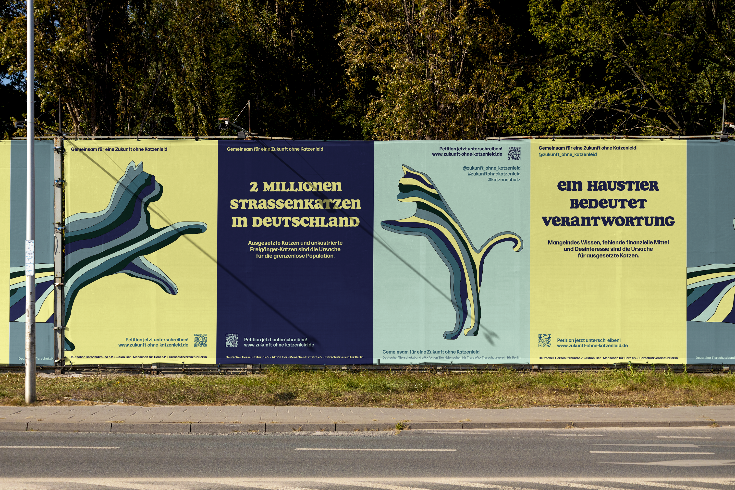 Die Katzenillustrationen sind für zukünftige Kampagnen beliebig erweiterbar. Sie ergänzen die klaren Botschaften in kontrastreichen Farben. Um eine möglichst große Reichweite zu erzielen, erarbeite ich eine crossmediale Kampagne. Durch den Zusammenschluss der Tierschutzvereine können vorhandene und weitere Zielgruppen erreicht werden. Print- und Onlinemedien leisten Aufklärungsarbeit und verfolgen, mittels einer Petition, das Ziel einer deutschlandweiten Katzenschutzverordnung.