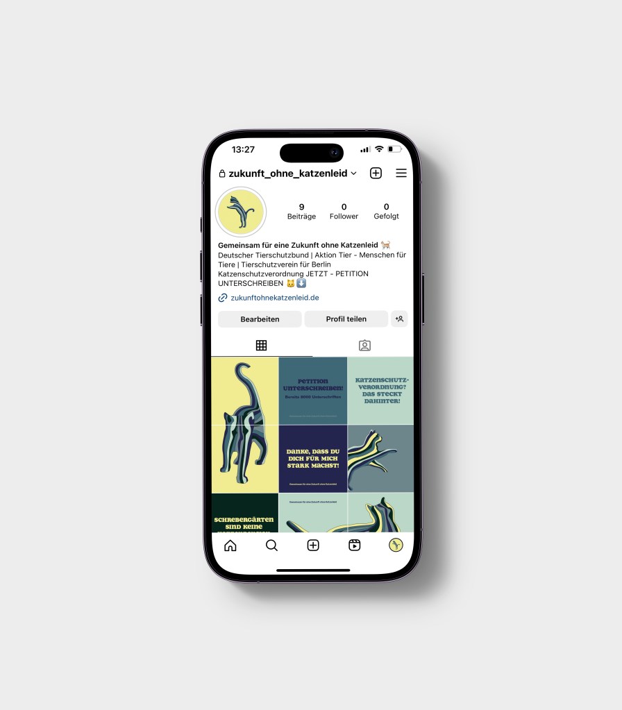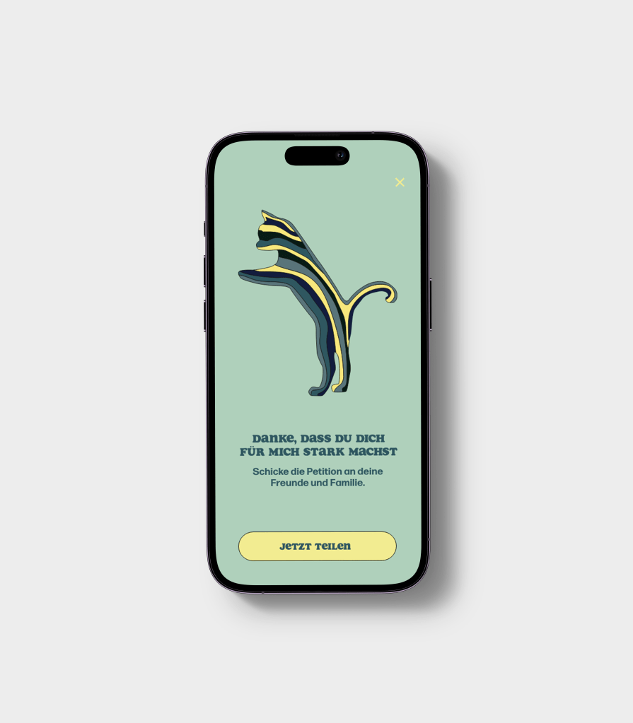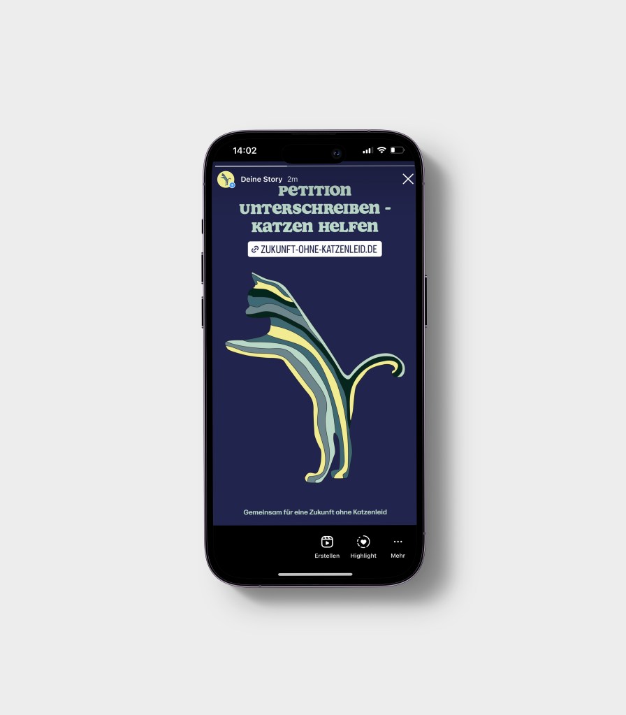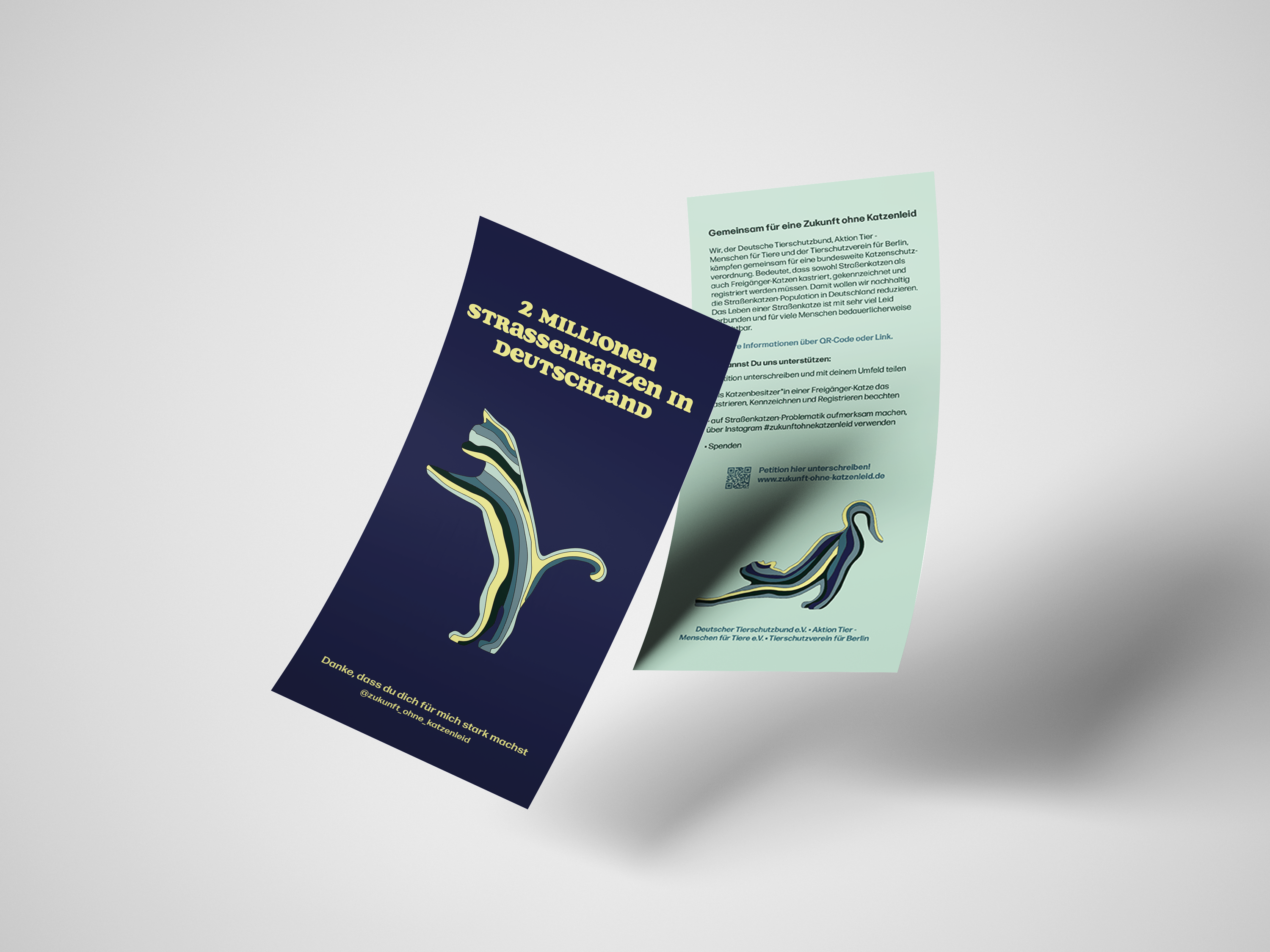 Die Katzenillustrationen sind für zukünftige Kampagnen beliebig erweiterbar. Sie ergänzen die klaren Botschaften in kontrastreichen Farben. Um eine möglichst große Reichweite zu erzielen, erarbeite ich eine crossmediale Kampagne. Durch den Zusammenschluss der Tierschutzvereine können vorhandene und weitere Zielgruppen erreicht werden. Print- und Onlinemedien leisten Aufklärungsarbeit und verfolgen, mittels einer Petition, das Ziel einer deutschlandweiten Katzenschutzverordnung.