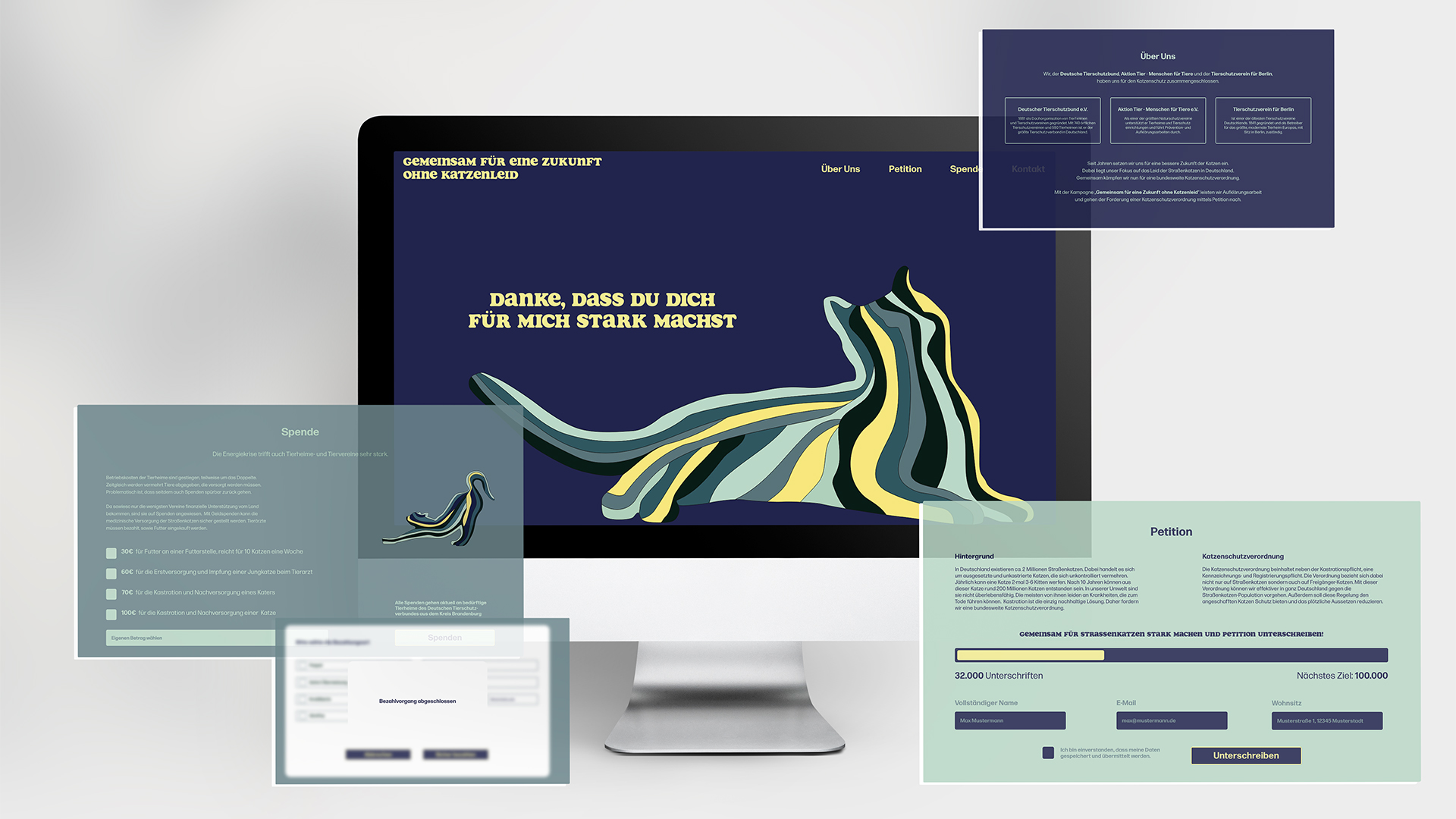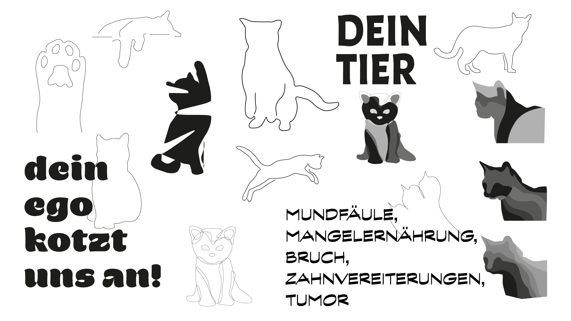 Die selbstgeführten Interviews mit drei Tierschutzvereinen unterstreichen die Notwendigkeit einer nachhaltigen Problemlösung und bilden die Basis meines Gestaltungskonzeptes. Seit Jahren dominieren süße Katzenbabys oder kranke Straßenkatzen die Kampagnen dieser Tierschutzvereine. Bewusst grenze ich mich von dieser Strategie ab und setze auf eine illustrative Herangehensweise in Kombination mit klarer Sprache.